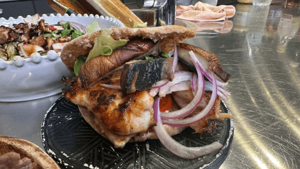 מוסיפים 2-3 נתחי פרגית ומעליהם מניחים ירקות – רצועות דקות של בצל סגול, פרוסת עגבנייה, עלה חסה ואת רצועות פטריית הפורטובלו הקלויה.
