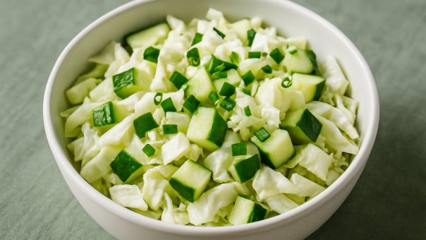 מוסיפים לקערת הכרוב בצל ירוק, מלפפונים, שמן זית, פלפל לבן, מיץ לימון וחומץ. מערבבים, מכסים